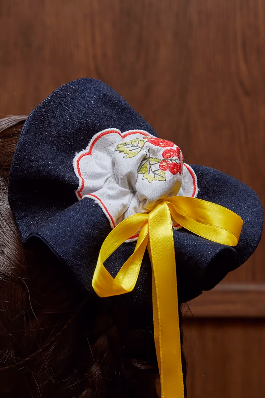 Notre bourse à chignon en denim doublé de fin de série est décorée par un napperon ancien brodé et se resserre à l’aide d’un ruban en satin.