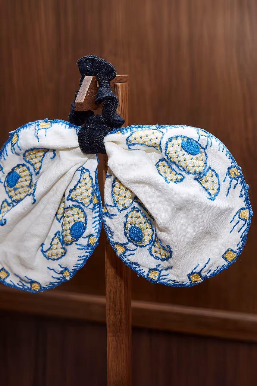 Notre chouchou est orné d’un nœud fait à partir d’un napperon ancien brodé et doublé à la main. Celui-ci se noue dans les cheveux à l’aide d’un élastique.