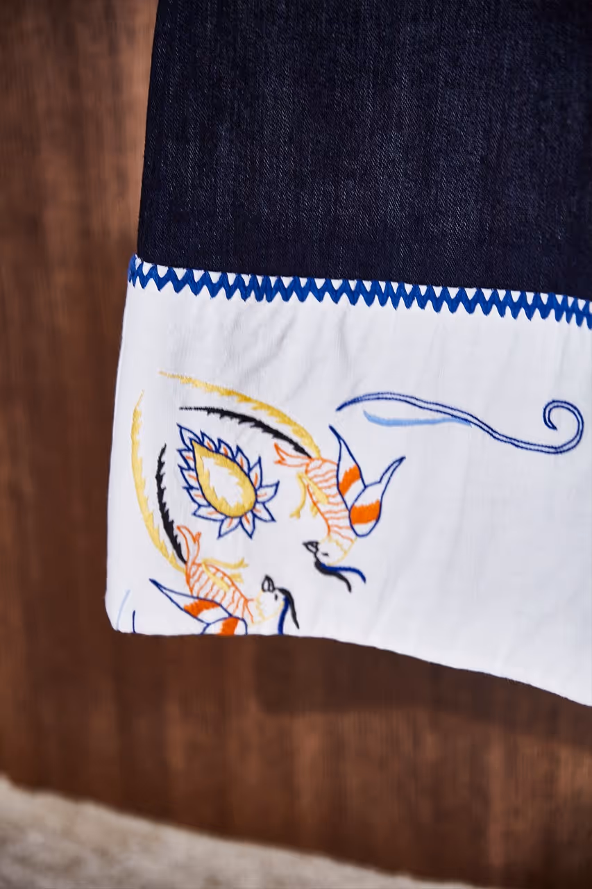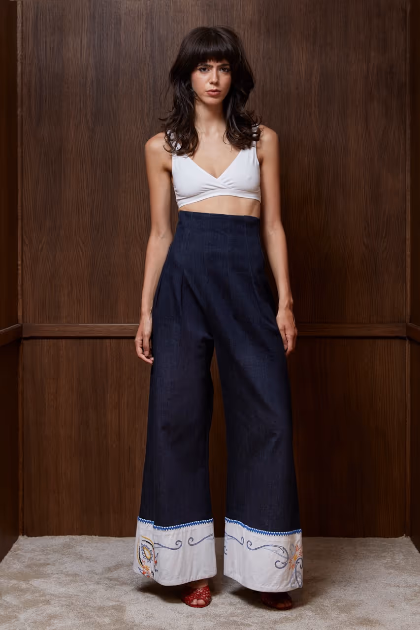 La coupe offre une forme très évasée au niveau des jambes tout en restant cintrée au niveau de la taille. Un napperon ancien brodé orne le revers du pantalon. Pour l’enfiler, un zip invisible est placé sur le côté.